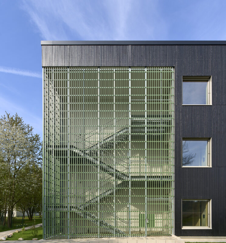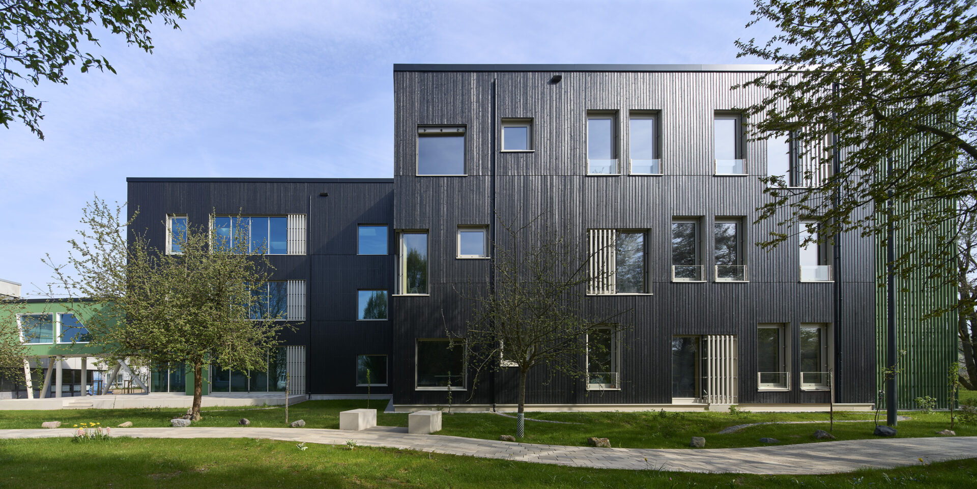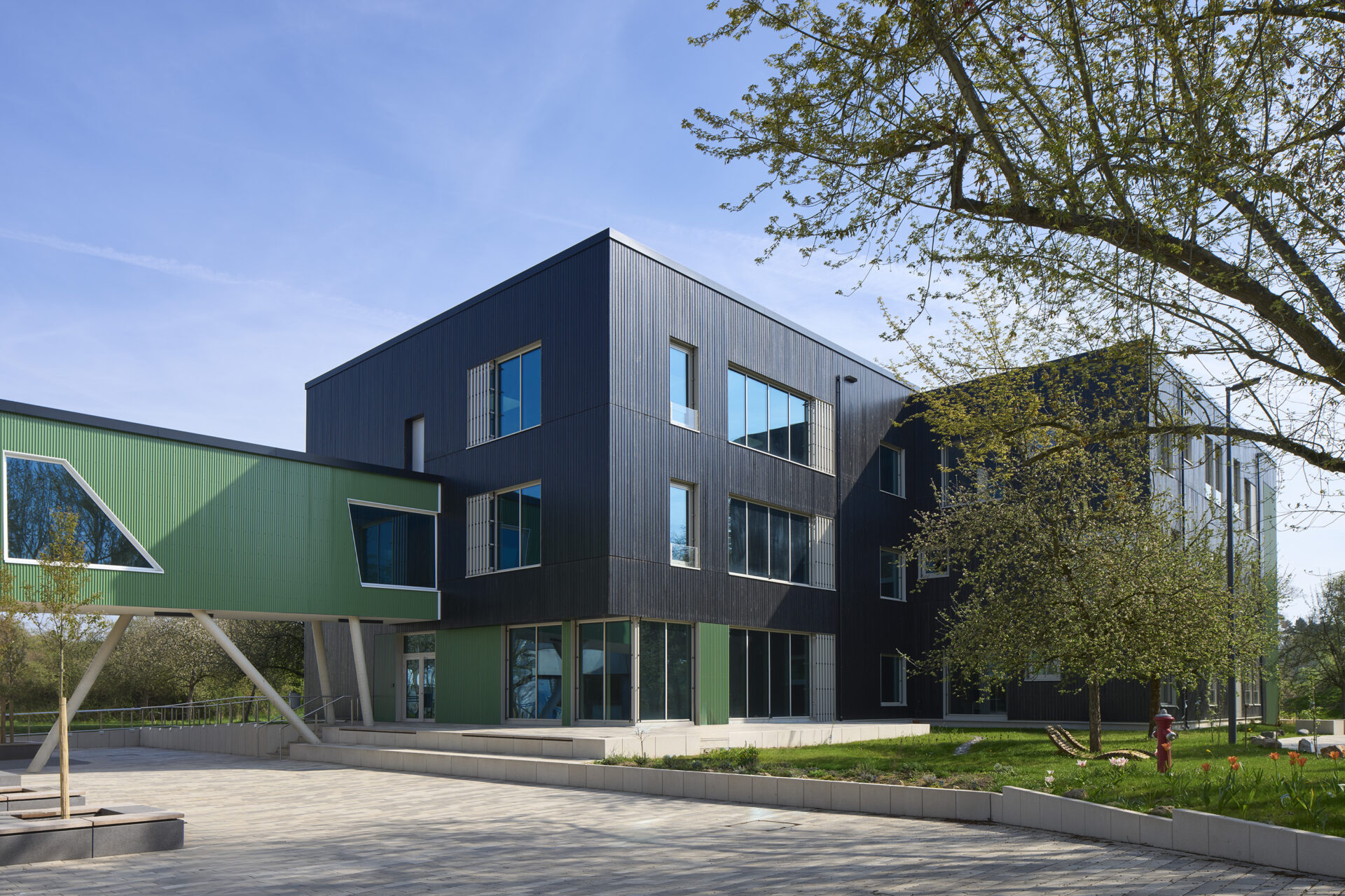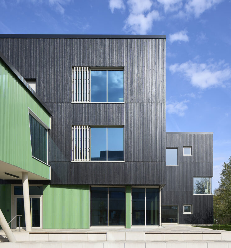 Das Albert-Einstein-Gymnasium erhält einen Erweiterungsneubau für die Naturwissenschaften. Der dreigeschossige Stahlbeton-Holz-Hybridbau mit zwei schwarzen Kuben ergänzt den Campus östlich. Neben Fachräumen und Sammlungen entstehen offene Lernlandschaften. Sichtbeton, sichtbares Brettsperrholz und eine karbonisierte Holzfassade folgen dem Prinzip der Materialauthentizität und verbinden Innen- und Außenraum gestalterisch.